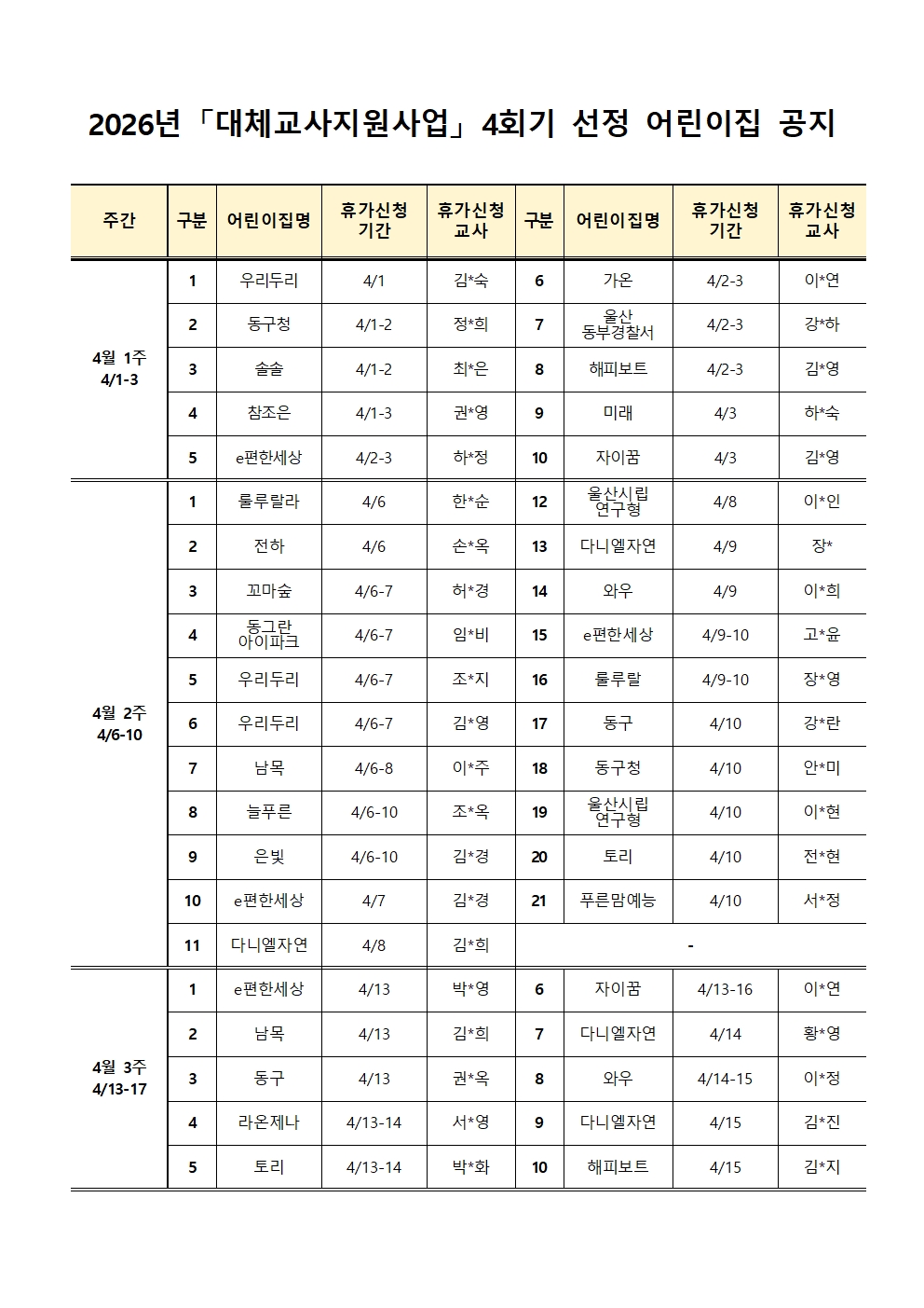 [¿ï»ê µ¿±¸À°¾ÆÁ¾ÇÕÁö¿ø¼¾ÅÍ] ´ëü±³»çÁö¿ø»ç¾÷ 2026³â 4ȸ±â ¼±Á¤°øÁö