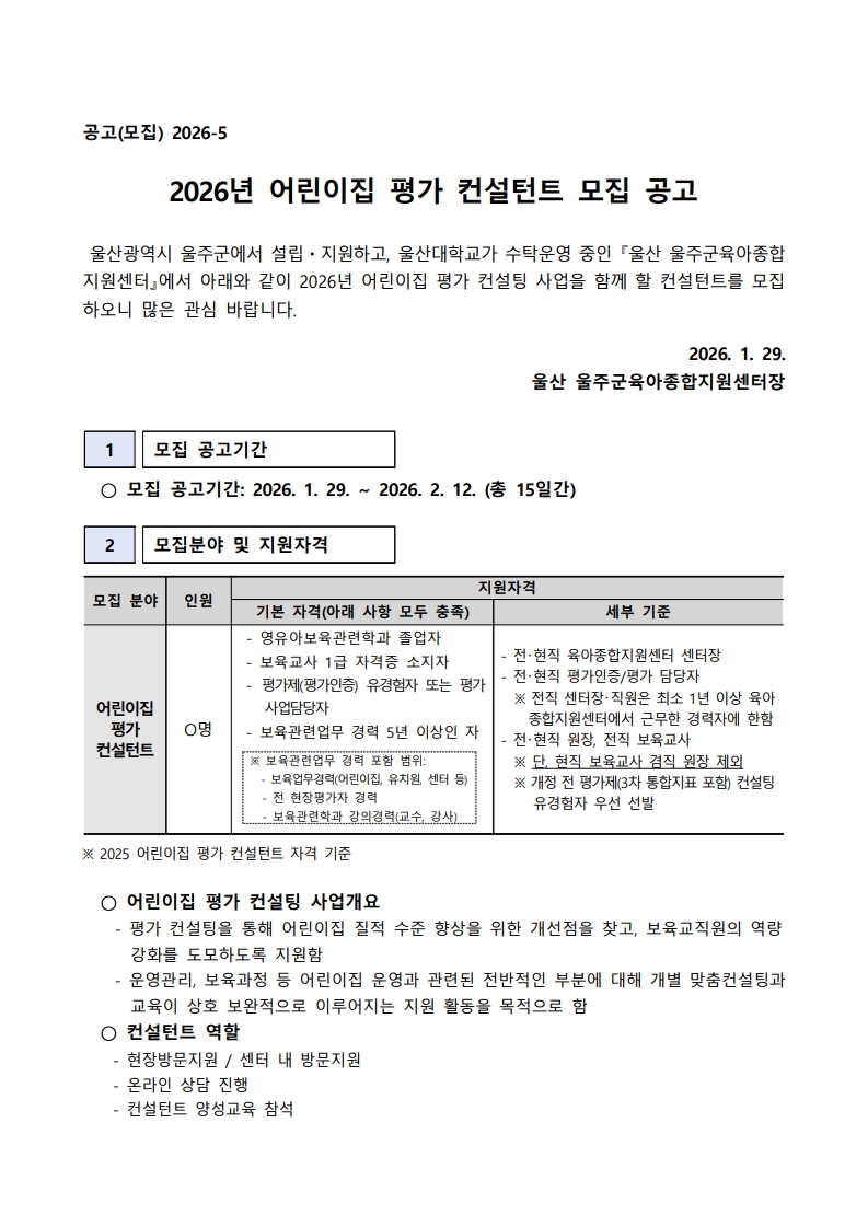 ¿ï»ê ¿ïÁÖ±ºÀ°¾ÆÁ¾ÇÕÁö¿ø¼¾ÅÍ Á÷¿ø(¾î¸°ÀÌÁý Æò°¡ ÄÁ¼³ÅÏÆ®) ä¿ë °ø°í