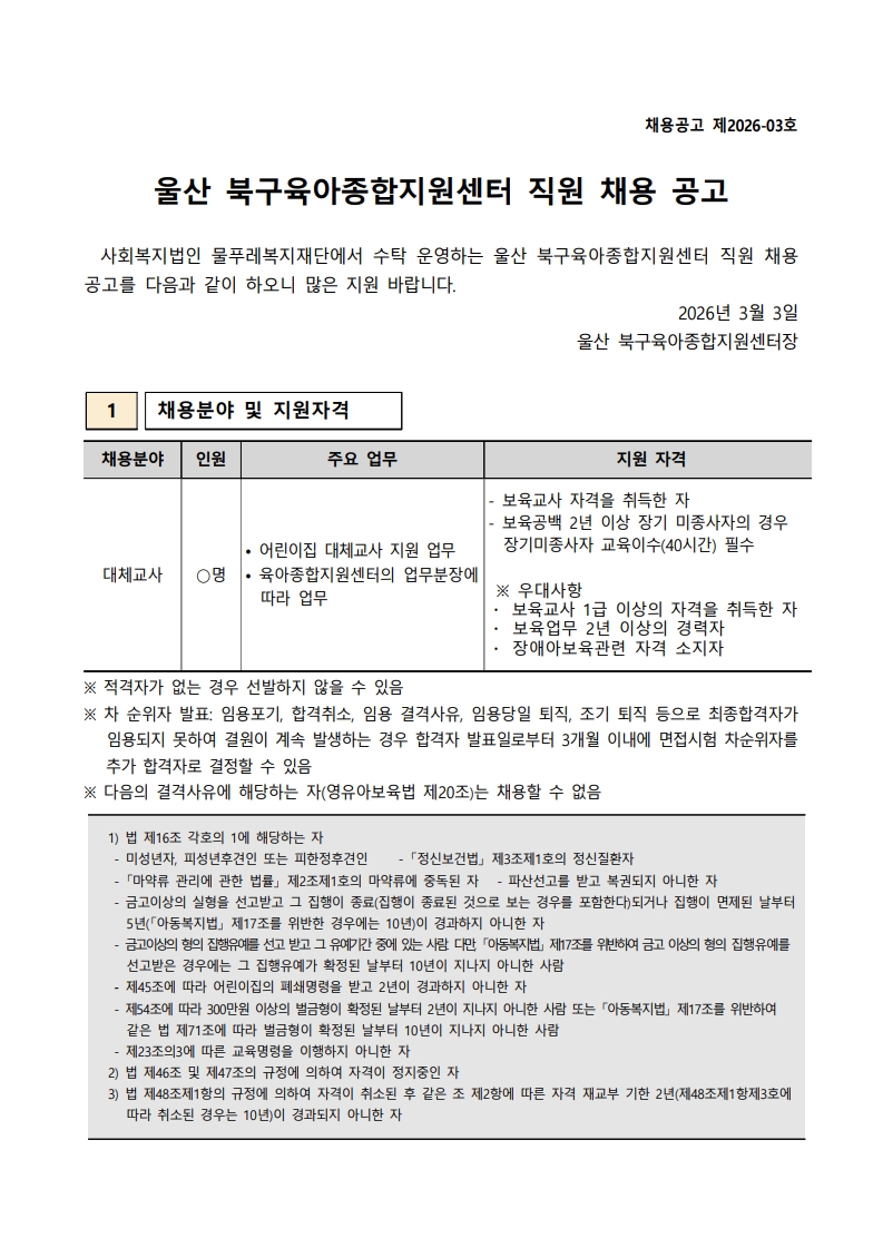 ¿ï»ê ºÏ±¸À°¾ÆÁ¾ÇÕÁö¿ø¼¾ÅÍ Á÷¿ø(´ëü±³»ç) ä¿ë °ø°í