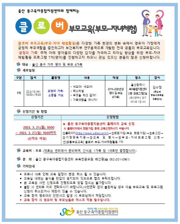 | [°øÅëºÎ¸ð±³À°] Ŭ·Î¹ö ºÎ¸ð-ÀÚ³àüÇèȰµ¿ 7Â÷(¿µ¾Æ) ±àÁ¤ÀÇ °¡Á·- ¼ÒdzÀ» °¡¿ä | |||