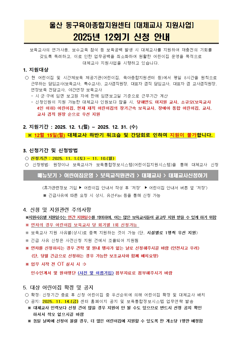 [¿ï»ê µ¿±¸À°¾ÆÁ¾ÇÕÁö¿ø¼¾ÅÍ] ´ëü±³»çÁö¿ø»ç¾÷ 2025³â 12ȸ±â ½Åû¾È³»