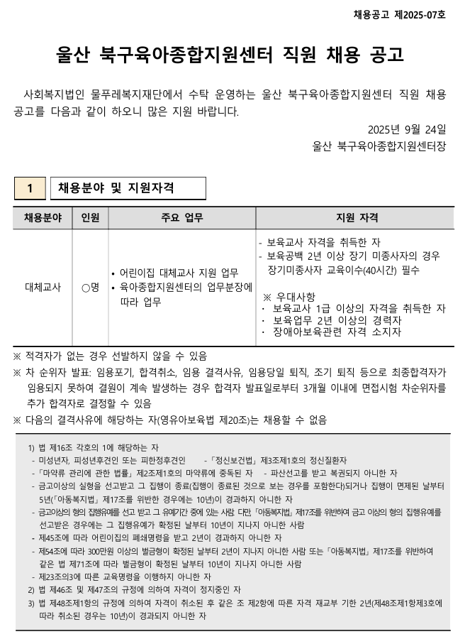 ¿ï»ê ºÏ±¸À°¾ÆÁ¾ÇÕÁö¿ø¼¾ÅÍ Á÷¿ø(´ëü±³»ç) ä¿ë °ø°í
