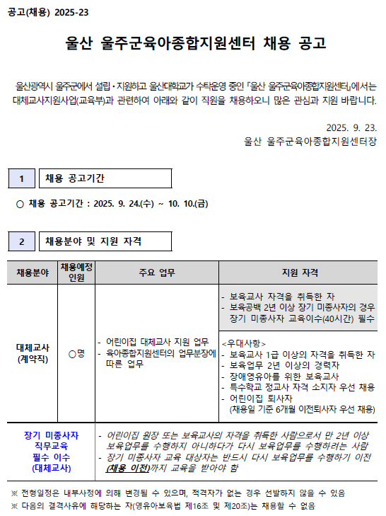 ÀÌÀü±Û | ¿ï»ê ºÏ±¸À°¾ÆÁ¾ÇÕÁö¿ø¼¾ÅÍ Á÷¿ø(´ëü±³»ç) ä¿ë °ø°í |