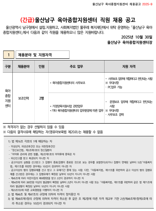 | ¿ï»ê ³²±¸À°¾ÆÁ¾ÇÕÁö¿ø¼¾ÅÍ Á÷¿ø(º¸Á¶ÀηÂ) ä¿ë °ø°í
