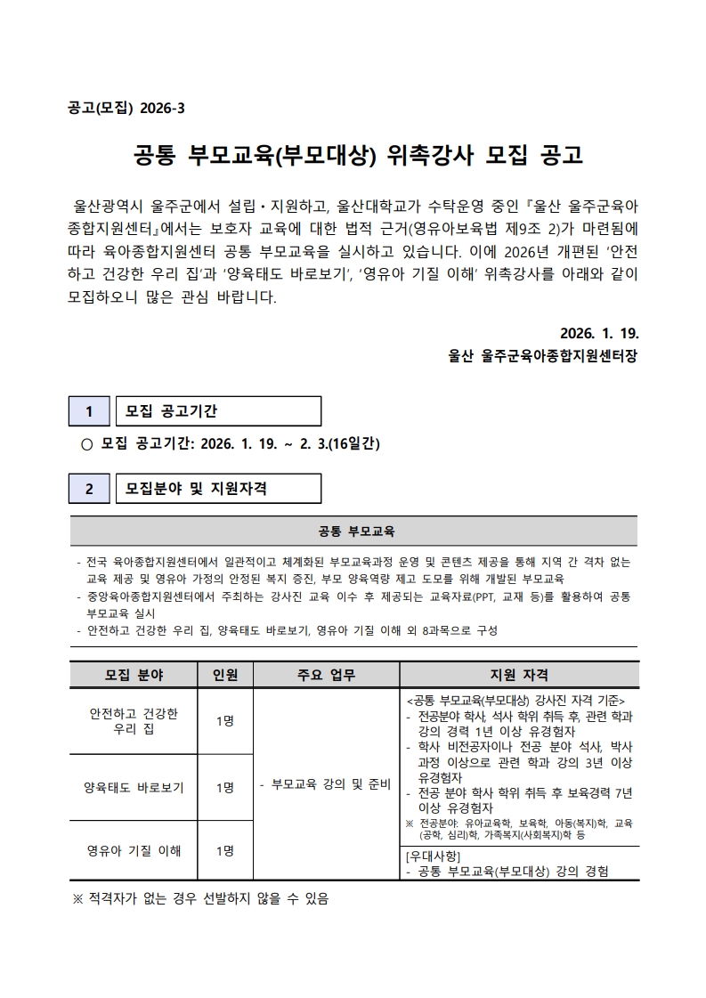 | ´ÙÀ½±Û | ¿ï»ê ¿ïÁÖ±ºÀ°¾ÆÁ¾ÇÕÁö¿ø¼¾ÅÍ Á÷¿ø(ºÎ¸ð‧ÀÚ³à üÇèȰµ¿ º¸Á¶°»ç) ä¿ë °ø°í |