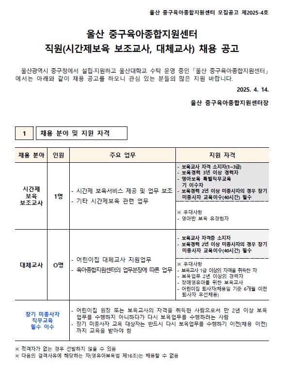 ¿ï»ê Áß±¸À°¾ÆÁ¾ÇÕÁö¿ø¼¾ÅÍ Á÷¿ø(½Ã°£Á¦º¸À° º¸Á¶±³»ç, ´ëü±³»ç) ä¿ë °ø°í