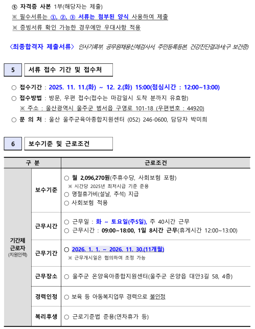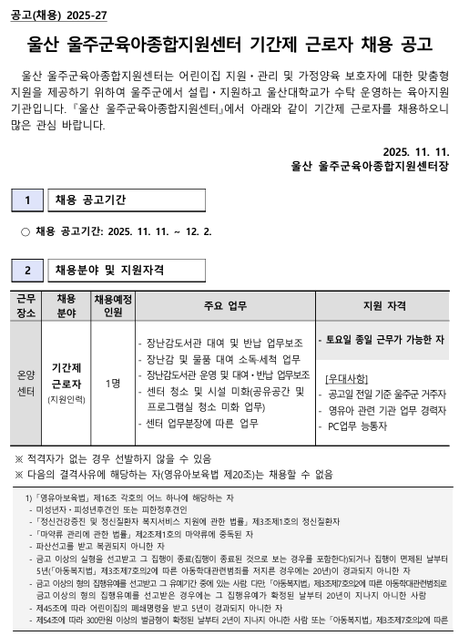 | ÀÌÀü±Û | ¿ï»ê ¿ïÁÖ±ºÀ°¾ÆÁ¾ÇÕÁö¿ø¼¾ÅÍ Á÷¿ø(º¸À°Àü¹®¿ä¿ø) ä¿ë °ø°í |