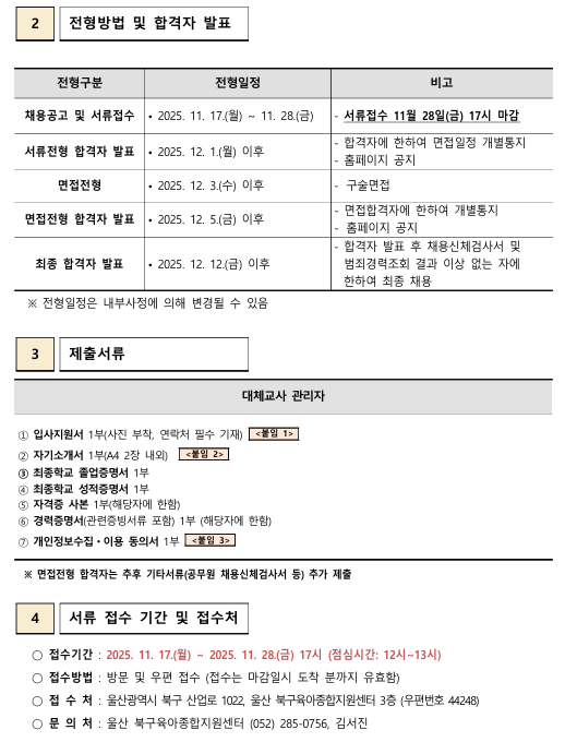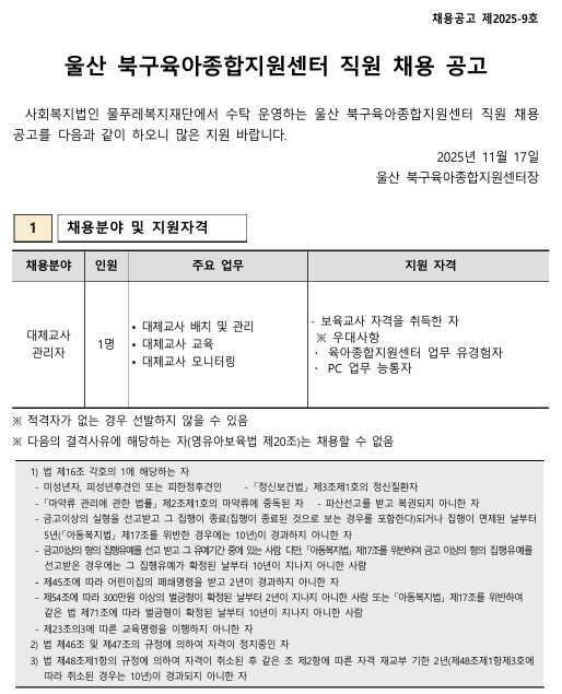 ¿ï»ê ºÏ±¸À°¾ÆÁ¾ÇÕÁö¿ø¼¾ÅÍ Á÷¿ø(´ëü±³»ç°ü¸®ÀÚ) ä¿ë °ø°í