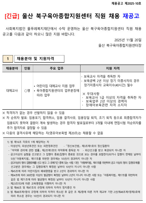 ¿ï»ê ºÏ±¸À°¾ÆÁ¾ÇÕÁö¿ø¼¾ÅÍ Á÷¿ø(´ëü±³»ç°ü¸®ÀÚ) ä¿ë Àç°ø°í