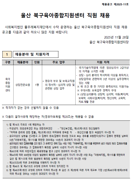 ¿ï»ê ºÏ±¸À°¾ÆÁ¾ÇÕÁö¿ø¼¾ÅÍ Á÷¿ø(»ó´ãÀü¹®¿ä¿ø) ä¿ë °ø°í