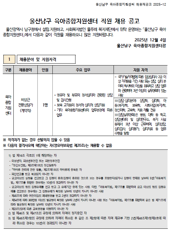 ¿ï»ê ³²±¸À°¾ÆÁ¾ÇÕÁö¿ø¼¾ÅÍ Á÷¿ø(ºñ»ó±Ù Àü¹®»ó´ã°¡) ä¿ë °ø°í