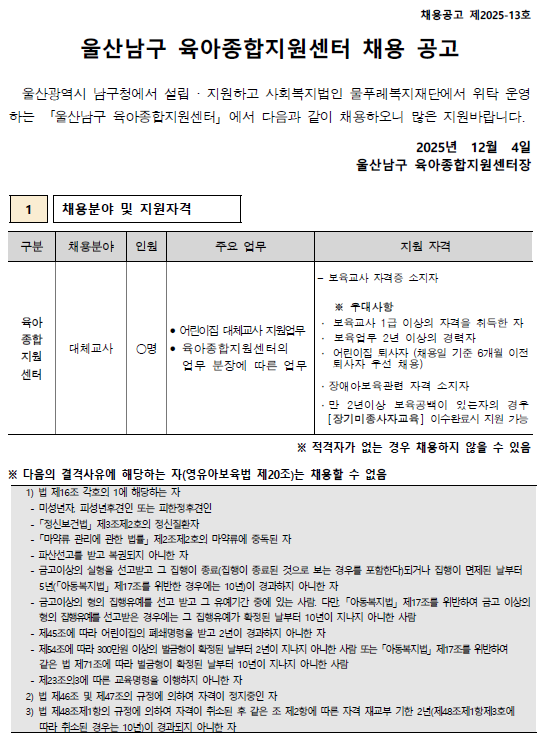 ¿ï»ê ³²±¸À°¾ÆÁ¾ÇÕÁö¿ø¼¾ÅÍ Á÷¿ø(´ëü±³»ç) ä¿ë °ø°í