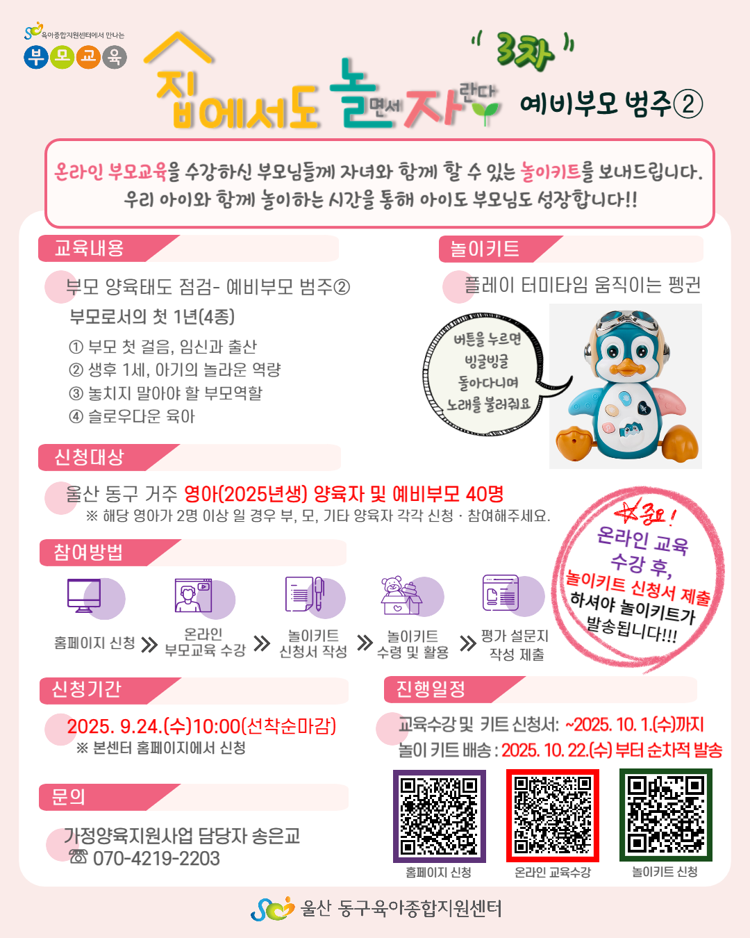 ¡Ø ½Åû ÀÌÈÄ~10.01.(¼ö)±îÁö ¿Â¶óÀÎ ºÎ¸ð±³À°À» ¼ö°­ÇÏ½Ã°í ³îÀÌŰƮ ½Åû¼­¸¦ Á¦Ãâ ÇÏ¿© Áֽñ⠹ٶø´Ï´Ù. ±âÇѳ» Á¦ÃâÇϽÃÁö ¾ÊÀ¸¸é ³îÀÌŰƮ°¡ ¹ß¼ÛµÇÁö ¾Ê½À´Ï´Ù. (½Åû ÀÚµ¿ Ãë¼ÒµÇ°í, ´ë±âÀÚ¿¡°Ô ±³À°±âȸ ºÎ¿©µÊ)