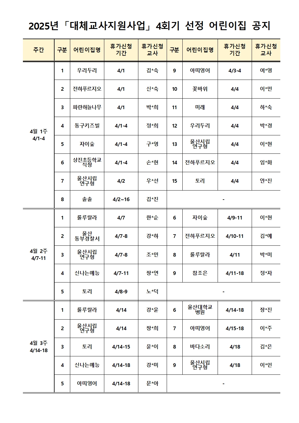 [¿ï»ê µ¿±¸À°¾ÆÁ¾ÇÕÁö¿ø¼¾ÅÍ] ´ëü±³»çÁö¿ø»ç¾÷ 2025³â 4ȸ±â ¼±Á¤°øÁö