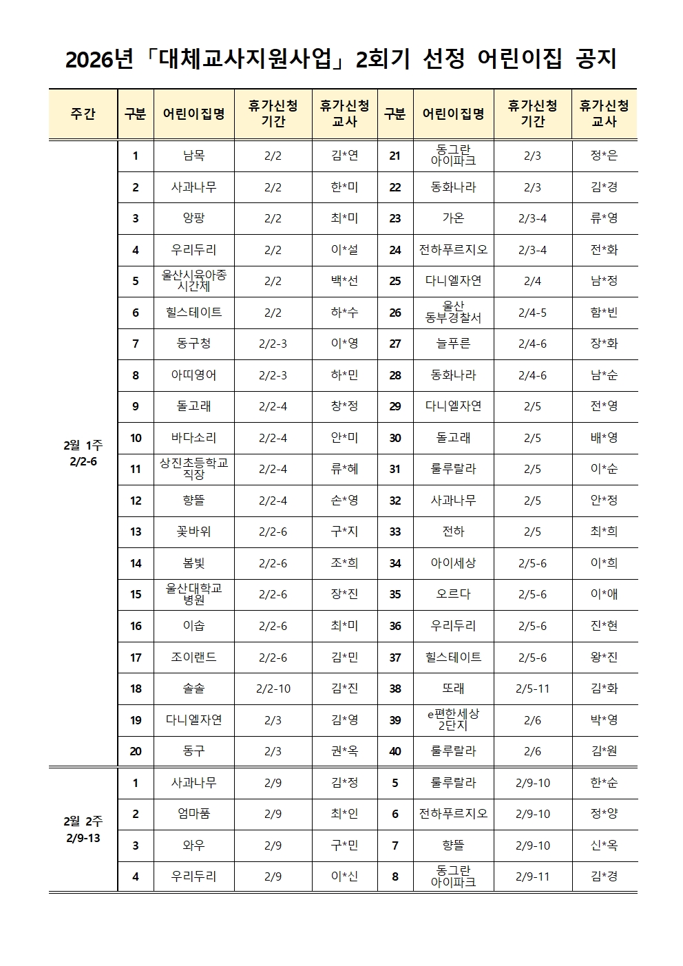 [¿ï»ê µ¿±¸À°¾ÆÁ¾ÇÕÁö¿ø¼¾ÅÍ] ´ëü±³»çÁö¿ø»ç¾÷ 2026³â 2ȸ±â ¼±Á¤°øÁö