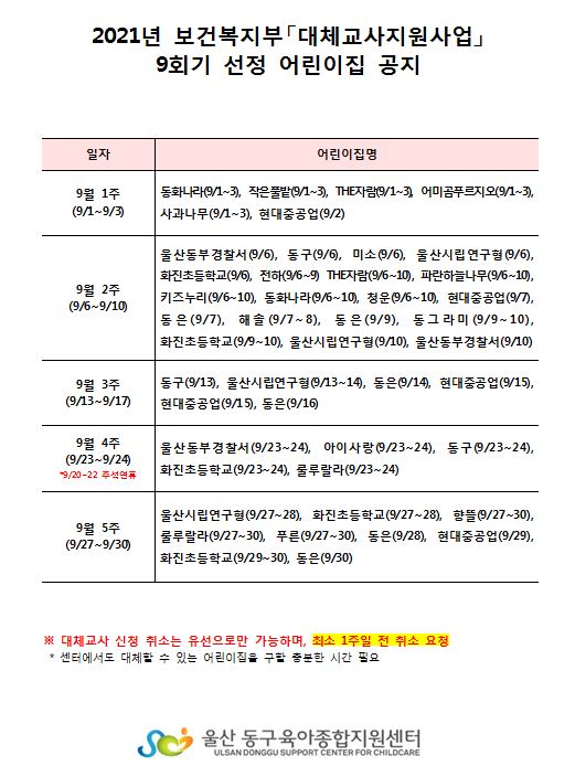 | ÀÌÀü±Û | [¿ï»ê µ¿±¸À°¾ÆÁ¾ÇÕÁö¿ø¼¾ÅÍ]2021³â ´ëü±³»çÁö¿ø»ç¾÷ 9ȸ±â ½Åû ¾È³» |