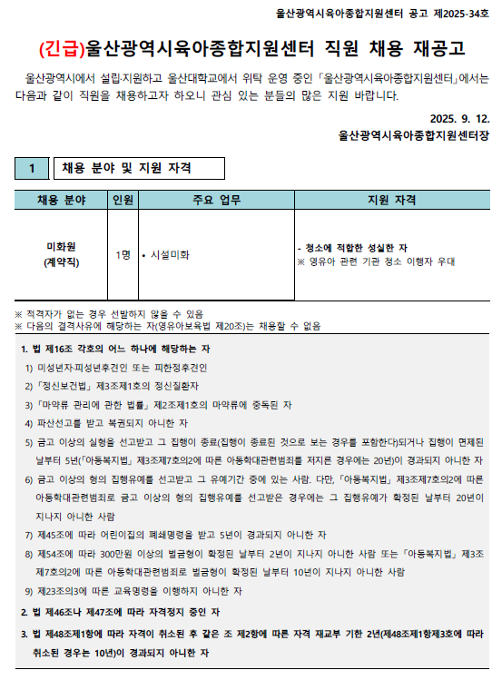 ´ÙÀ½±Û | ¿ï»ê ºÏ±¸À°¾ÆÁ¾ÇÕÁö¿ø¼¾ÅÍ Á÷¿ø(´ëü±³»ç) ä¿ë °ø°í |