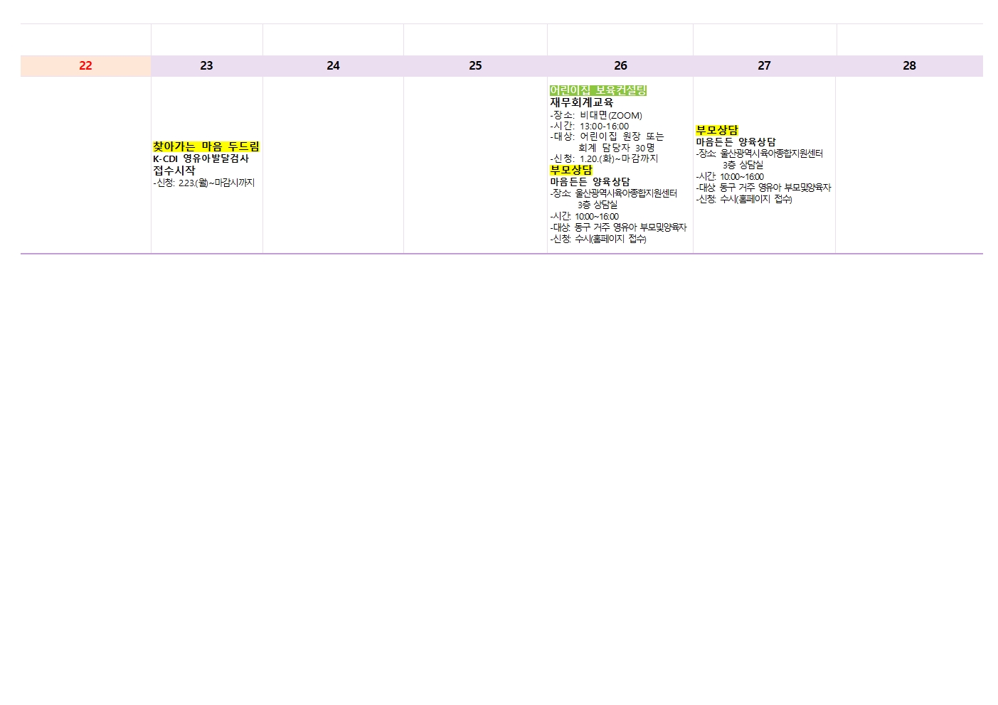 | ´ÙÀ½±Û | ¿ï»ê ¿ïÁÖ±ºÀ°¾ÆÁ¾ÇÕÁö¿ø¼¾ÅÍ Á÷¿ø(ºÎ¸ð±³À° À§Ã˰»ç) ä¿ë °ø°í |