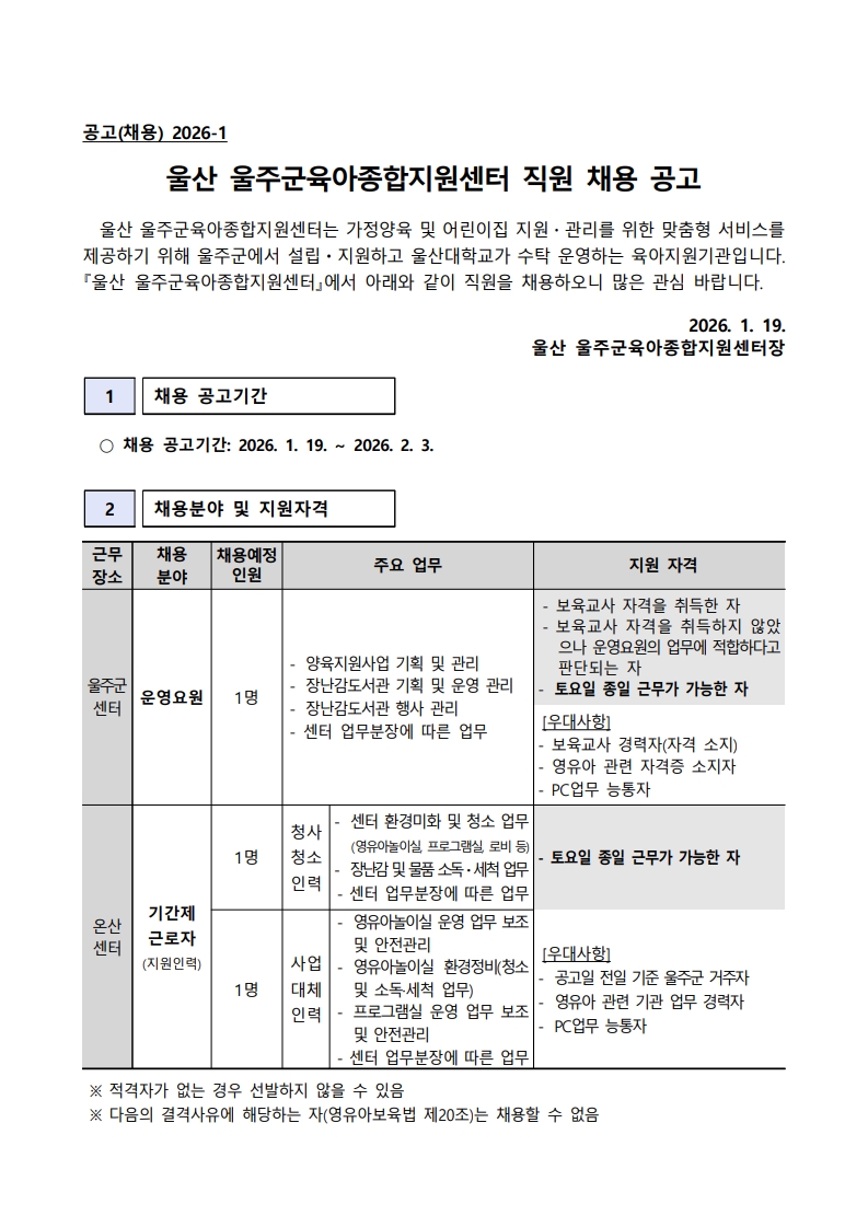 ¿ï»ê ¿ïÁÖ±ºÀ°¾ÆÁ¾ÇÕÁö¿ø¼¾ÅÍ Á÷¿ø(¿î¿µ¿ä¿ø, ±â°£Á¦ ±Ù·ÎÀÚ) ä¿ë °ø°í