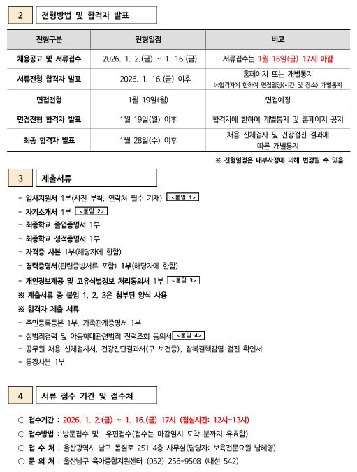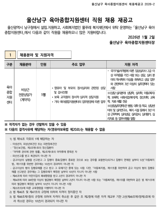 | ´ÙÀ½±Û | ¿ï»ê ³²±¸À°¾ÆÁ¾ÇÕÁö¿ø¼¾ÅÍ Á÷¿ø(´ëü±³»ç, ´ëüÁ¶¸®»ç) ä¿ë °ø°í |